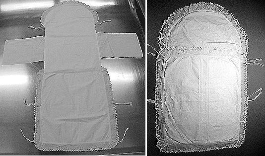 Suorakaiteen muotoinen, pääpuolesta pyöristetty makuunpussi, jossa pohja on kaksinkertainen napein suljettava pussi. Peittosa myös kaksinkertainen. Pohjaan kiinnitetty sivuille suorakaiteen muotoiset kangaskaitaleet ja solmiamisnauhat.