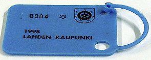 1998 Lahden kaupunki. Kulmassa Lahden kaupungin vaakuna. Numerot 0801-0804. Suorakaiteen muotoinen, reunat pyöristetty. Toiselta lyhyeltä sivulta lähtee muovinen lenkki.