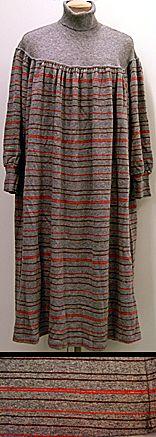 Pohjepituinen, vyötärösaumaton neulepuku, jossa yläosan pyöriöltä lähtee poimutettu löysähkö alaosa ja pitkät hihat. Hihojen suissa 1x1 resori puvun raidoitusta.. Pyöriö yksivärinen, samoin poolokaulus 1x1 resorineulosta.