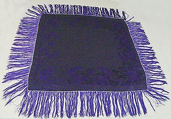 Kasviaiheinen kuvionti levehkönä raitana huivin reunoissa, keskusta kuvioton., Reunoissa hulpiot, päissä kapeat koneommelpäärmeet. Pitkät tiheät hapsut.