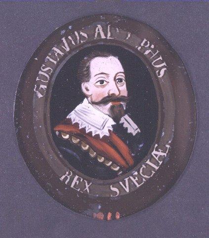 Soikealle lasinkappaleelle tehty maalaus. Miehen rintakuva oikealle. Ruskeat hiukset, pujoparta ja viikset. Haarniska ja leveä pitsikaulus, punainen olkanauha. Tumma tausta. Kuvasoikion ympärillä harmaa ja ruskea reunus, jossa on osittain kulunut teksti: GUSTAVUS ADOLPHUS REX SVECIAE. Kiinnitetty pahviseen kehykseen. Kuuluu kolmentoista ruotsalaisen hallitsijan muotokuvasarjaan.
