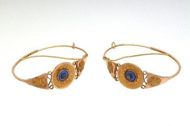 Pari suuria korvarenkaita, jotka on koristettu sinisellä ja siihen kiinnitetyllä pienemmällä valkoisella kivellä.