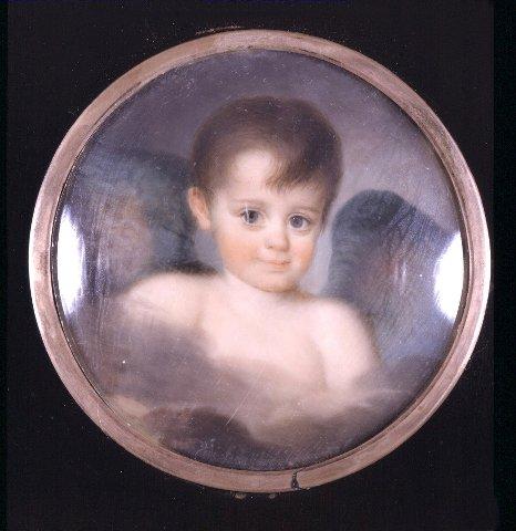 Pyöreä miniatyyri. Rintakuva pilven reunan takaa katsovasta pikkulapsesta, jolla siivet. Lapsella ruskeat hiukset ja tummansiniset silmät. Siivet vihertävän siniset. Etualalla rusottavan harmaita pilviä, tausta siniharmaa. Kuvan päällä kupera lasi. Kapea metallikehys. Sijoitettu suorakaiteen muotoiseen, mustaksi maalattuun puukehykseen yhdessä minatyyrien KM 26069:275.1 ja 3-6 kanssa. Puukehyksen yläreunassa metallinen ripustuslenkki ja -rengas. Miniatyyri esittää yksityiskohtaa Dresdenissä olevasta taulusta. Lasta pidettiin Alexander Armfeltin näköisenä.
