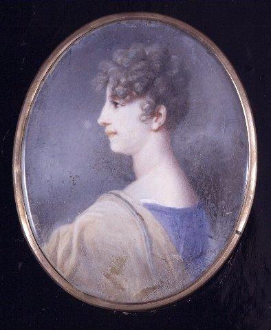 Soikea miniatyyri, nuoren naisen rintakuva vasemmalle, vasen hartia nähty lähes takaa, pää profiilissa vasemmalle. Ruskeat hiukset, kiharat otsalla ja ohimoilla, takaa ylös nostettu. Ruskeat silmät. Sininen puku, vaaleanruskea huivi vasemmalla olkapäällä. Siniharmaa tausta. Ohuet kupari(?)kehykset. Kuvan päällä lasi, takana pahvi. Kiinnitetty mustaksi lakattuun, viiteen osaan taittuvaan puuraamiin, jossa miniatyyrit KM 26069:278.1-8.