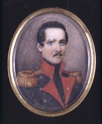 Soikea miniatyyri, miehen rintakuva oikealle, katse eteen. Tummat, lyhyet hiukset, viikset. Siniset silmät. Musta univormu, punainen kaulus. Kultaiset epoletit, kaluunat ja napit. Musta kaulaliina. Ruskea tausta. Ohuet messinki(?)kehykset. Kuvan päällä lasi, takana pahvi. Miniatyyri on kiinnitetty mustaksi lakattuun, viiteen osaan taittuvaan puuraamiin, jossa miniatyyrit KM 26069:278.1-8.