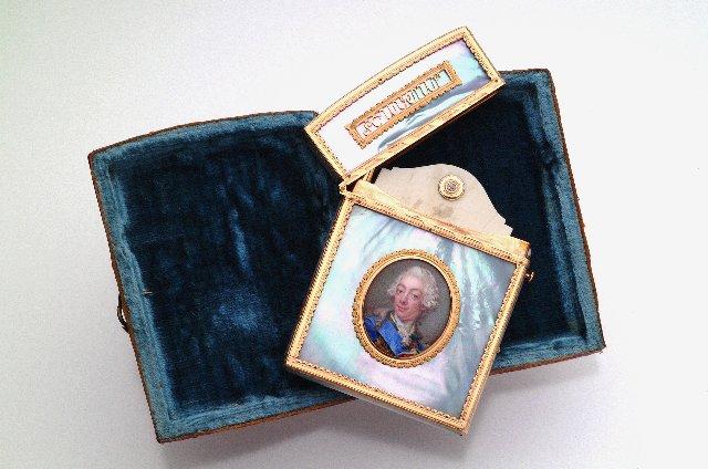 Muistikirjakotelo kultaa, helmiäistä ja emalia, sisällä norsunluinen muistiinpanolevy. Kannessa Kustaa III:n medaljonkiminiatyyri emalia. Takana siniselle silkkimoireepohjalle kirjottu kruunattu G ja sen yläpuolella d""amitie. Säilytysrasiassa sininen samettivuori.