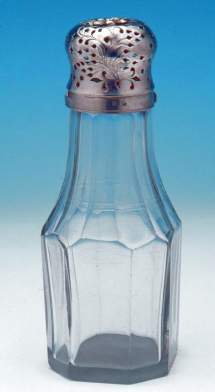 Sokeritölkki, lasia, kansi hopeata. Kansi rokokootyylisen lävistekoristelun täyttämä; reiät sovitettu sirojen oksien lehti- ja kukkakuvioihin. Kannen nuppuna on syvennyksessä oleva 5-lehtinen kukka. Kansi kaarevasivuinen, pyöreäpäinen. Pullo on tasapohjainen, alaosastaan 8-sivuinen; pullon kaula on hiottu 12-tahkoiseksi; tahkot ovat hieman sisäänpäinkaartuvia. Suussa hopearengas.