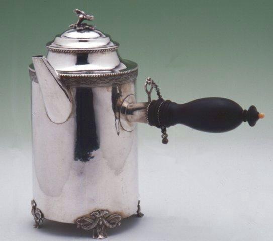 Kahvikannu, hopeaa. Korkea, lieriömäinen; vaakasuorasti sivulle ulkoneva sorvattu musta, puinen kädensija päättyy pieneen luunuppiin. Neljä pientä, lehden ja köynnöksen muodostamaa jalkaa. Suora, suuhun kapeneva nokka. Kannun yläreunaa koristaa stanssattu nauha, jossa on pystyviirupohjalla kaksi aaltoviivaa.