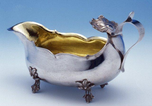 Mäyräkoiran muotoinen, yläreuna kaareva, nokka kapea. Alla neljä kukkaa muistuttavaa lyhyttä jalkaa. Korva litteä, yläpäässä leveä kukkakoriste. Sisusta kullattu.