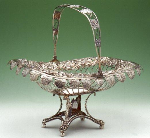 Jalallinen. Pohja on punottu hopealangasta; reunassa on leveä stanssattu ja lävistetty viininlehvänauha, syrjässä on ulkonevat lehtipykälät. Sangassa on kahden hopeanauhan välissä harvakseltaan viininlehtiä. Nelihaaraisesta jalustasta nousee 4 ohutta lehteä kannattamaan koria, keskellä on lootuksenkukka.