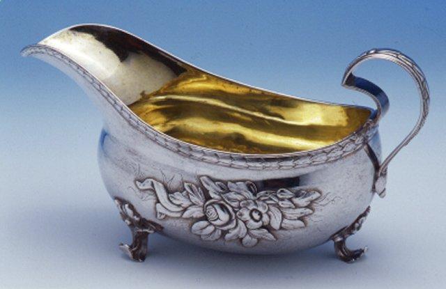 Soikea, matala; leveä, kaareva nokka. Litteä kädensija, joka alhaalla päättyy kotilomaiseen kierteeseen. Kolme pientä jalkaa, jotka liittyvät lehtimäisesti kermakon pintaan. Syrjän koristeena laakerinauha. Kummallakin sivulla plastilliset kukkaoksat. Kädensijan päällä laakerinauha. Kullattu sisältä. Jalat taivutettu hieman käppyrään.