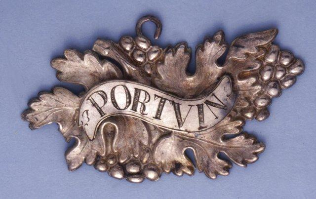 Hopeavitjoista riippuu ohut viininlehden muotoiseksi puristettu levy, jonka keskellä on nauhassa kirjoitus PORTVIN.