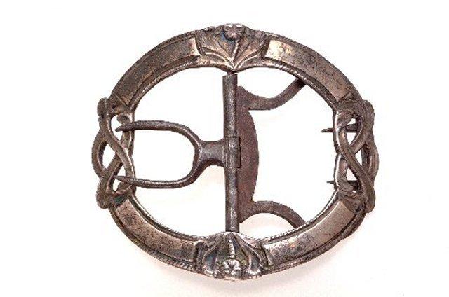 Soikea kengänsolki, kehän koristena on päissä pienet kiemurat ja keskellä ylhäällä ja alhaalla kukat. Rautaiset kiinnittimet.