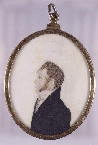 Soikea miniatyyri, miehen rintakuva vasemmalle, sivukuva tummaan frakkiin pukeutuneesta miehestä. Valkoiset liivit ja kaulaliina. Ruskeat hiukset, poskiparta. Valkoinen tausta. Kapea yksinkertainen kehys kullanväristä metallia. Ripustuslenkki ja -rengas.