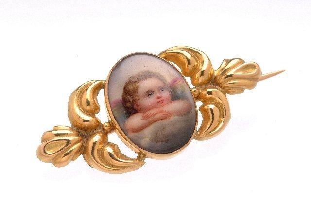 Emalimedaljonki, jossa on kuva Rafaelin Sikstiiniläismadonnan toisesta kerubista upotettuna kullattuihin lehtiin.