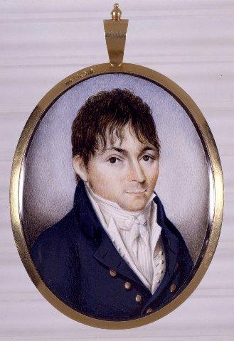 Soikea miniatyyri. Nuorehkon miehen rintakuva, vartalo oikealle, katse eteenpäin. Tummanruskeat eteenpäin kammatut hiukset, ruskeat silmät. Musta takki, kullanväriset napit, valkoinen liivi ja kaulaliina. Valkoinen korkeakauluksinen paita. Siniharmaa tausta. Kultakehys jossa ripustuslenkki. Kääntöpuolella reunassa ruskeista hiuksista punottu palmikko. Keskellä kultakehyksen sisällä valkoisella emali(?)pohjalla kultakirjaimin monogrammi JGÖ. Lasi sekä miniatyyrin että kääntöpuolen päällä.