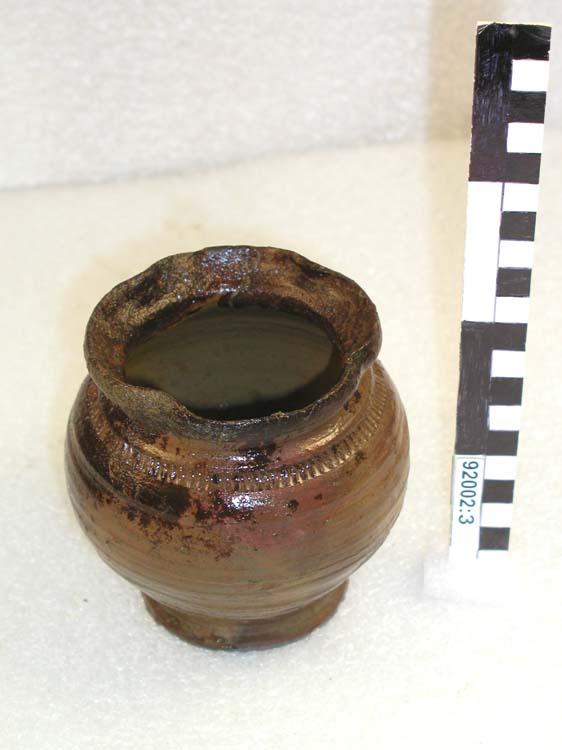 Pulleavatsainen keramiikkaruukku. Suureuna muotoiltu "neliapilan" malliseksi. Ruukku on leikattu irti dreijasta. Astian kylkiosassa loiva rihlauskoristelu. Astian yläosassa, olan yläpuolella rullaleimalla tehty pykäläviivakoristelu. Esineen konservointi on yhä kesken.