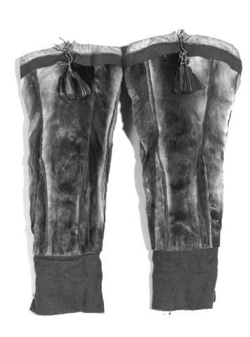 Ruskeat peurannahkaiset säpäkkeet, neulotut kuudesta kaistaleesta, joiden saumassa punaista ja keltaista flanellia: alapään jatkokset kuin myös yläsyrjän reunus ovat punaista villakangasta; yläsyrjässä myös tupsut punaisesta ja keltaisesta flanellista.