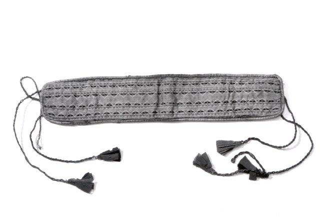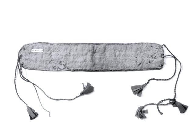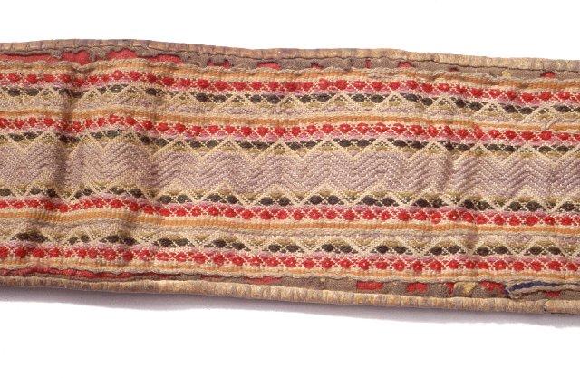 Leveällä nauhapirralla kudottu, monivärinen tiukuriisi. Pohjaloimi ja -kude luonnonvalkoista puuvillaa, kuviokuteet villaa. Tausta vuorattu luonnonvalkoisella saralla, sisäpuolelta vahvistettu punaisella veralla. Reunat on huoliteltu nahkasuikaleella. Toisessa päässä kaksi nahkanyöriä (irronnut nyöri on solmittu yhteen kiinniolevista), toisessa kaksi ehjää ja yksi katkennut. Nyörien päissä on tupsut, jotka on tehty hapsullisisksi leikatuista punaisista, keltaisista ja sinisistä verkatilkuista.