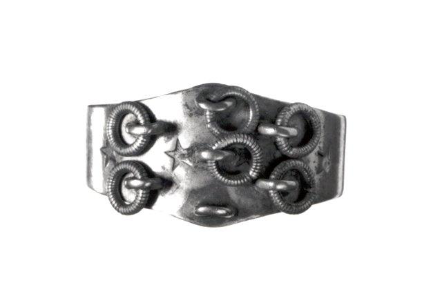 Hopeinen sormus, joka on varustettu kahdeksalla renkaalla, joista yksi pudonnut.