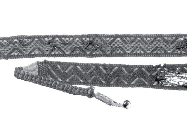 Kengänpaulat, villaiset, nauhapirralla kudottu. Väreinä tummansininen, punainen ja keltainen. Paulan päät on vahvistettu kangaspaloilla ja nyörien päät palmikoitu. Nyörin päässä on nahkavahvistus sekä lasinen kiinnitin. Paula on paikoitellen kulunut puhki.