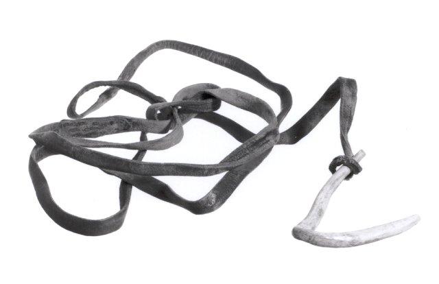 Tukeva nahkahihna, jossa paikoin on vielä karvoja jäljellä. Hihnan päässä silmukka, johon on kiinnitetty sarvesta valmistettu koukku. T.I. Itkonen: Kirjoituksia lappalaisten elintavoista II, s.198 alk.