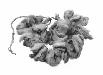 Kaksi yhteensidottua narulenkkiä, joihin on pujoteltu yhteensä 95 poron korvan kärkeä.