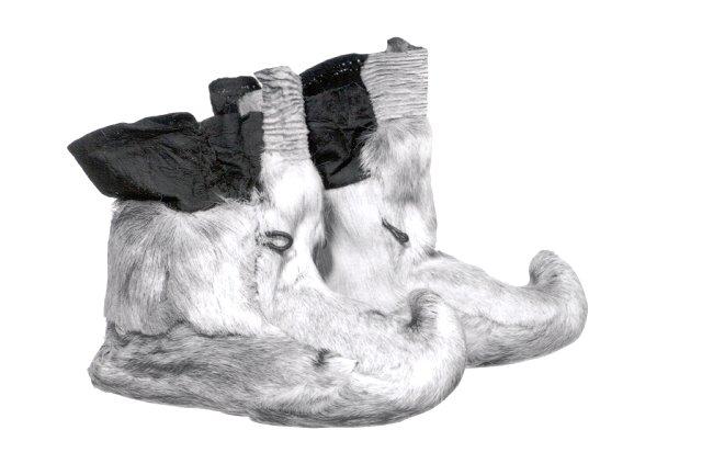 Tavallisen malliset, tereettömät, valmistettu vaaleasta poron turkiksesta. Ruojuksen yläpuolella n. 7,5 cm:n korkuinen kaistale poron sisnanahkaa ilttiä lukuunottamatta. Iltin yläreuna n. 4 cm:n korkeudelta lyhytkarvaiseksi leikattu. Jalkineet ovat käyttämättömät.