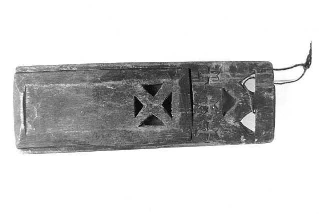 Matala kotelo, joka on varustettu päältä vedettävällä kannella. Kotelo-osan pituus 9,5 cm, jonka jälkeen kotelo kapenee kohti kärkeä. Kansi on koristeltu neljällä läpileikatulla kolmionmuotoisella lovella. Samanlaisia lovia on kolme myös kotelon päässä; niiden alle on kaiverrettu kolme ristiä rinnakkain. Kotelo on tyhjä.