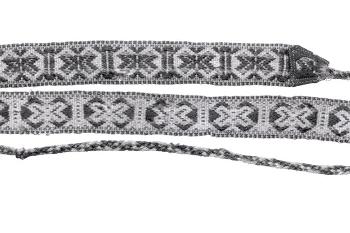 Paula, miehen. Nauhapirralla kudottu valkopunasinikirjava nauha, jonka päissä samanväriset nyörit. Paula on katkennut, mutta ommeltu koneella yhteen. Päät letitetty. Päät vahvistettu kankaalla.