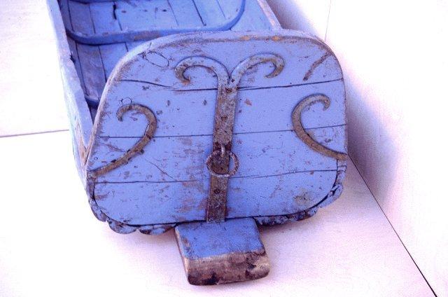 Ajoahkio, sininen. Laidakset kiinnitetty seitsemällä kaarella. Malli "uutta" yleistä ajoahkiotyyppiä: perälauta korkea, reunalaidakset nousevat hyvin pystyjyrkässä kulmassa, keulan suippeneminen tehty jyrkähkönä kaarena. Keulakaari päältä raudoituksella vahvistettu, samoin istuinlaudan liitäntä sivulta. Perälaudan takaraudoitus yleistä mallia: kolmen kaariraudan kuvio, keskiraudassa rengas. Ahkio oli jo ostettaessa 1940-luvulla sininen, takalaudan raudat maalattu punertaviksi (mistä maali kulunut pois). Oula Aikio on myöhemmin uusinut sinisen maalauksen; maalia on vedetty myös perälaudan rautojen yli. Suurin leveys (ulkomitat) 49 cm, emäpuun kannas, joka ulottuu perälaudan taakse 14 cm, perälaudan korkeus sisältä mitaten 46 cm.
