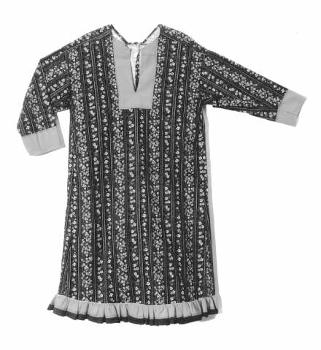Käyttämätön, ruskeapohjaista ostopuuvillaa. Takakappale muodostuu neljästä täyspitkästä suikaleesta, sekä sekä niihin vyötärön alapuolelle ommelluista väljyyttä antavista kiiloista. Hihansuut, pääntie sekä helma koristeltu punaisella verkakaistaleella.