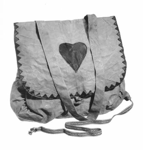 Alaspäin levenevä, alareunastaan pyöreäkulmainen laukku, joka on osittain käsin ommeltu. Laukun pohjaväri on ruskea. Etu- ja takakappale sekä sivujen alalaidat on samaa kappaletta. Sivukappaleiden yläosat sekä kansi ovat erilliset. Sivukappaleiden alalaidat on poimutettu ommeltaessa kiinni etu- ja takakappaleisiin. Kaikissa saumoissa on mustat keinonahkatereet. Kannen (kork. 38 cm) reunat on pyöristetty ja koristettu mustasta keinonahasta leikatulla sahalaitareu- nuksella. Keskelle kantta on ommeltu musta sydän (kork. 13 cm). Kannen alalaidassa on kiinnittämistä varten raksi, jonka läpi pujotetaan laukun pujotetaan etukappaleeseen vastaavalle kohdalle kiinnitetty rullalle kääritystä nahasta tehty vastakappale. Etukappaleessa kannen alla on tasku (21 x 26 cm), jonka reuna on huoliteltu mustalla nahkakaiteella. Tasku suljetaan solmimalla kahdella nahkasuikaleella. Laukun suun päärmeessä on reikiä, joiden läpi on sivukappaleiden ylälaitaan solmitut nahkasuikaleet pujotettu vuorotellen etu- ja takakappaleeseen siten, että laukun suu sulkeutuu tiiviisti litteän muotonsa säilyttäen. Takakappaleen ylälaitaan on kahdesta kohtaa ommeltu kaksinkertainen nahkahihna, jonka toinen reuna on tikattu kiinni. Laukun alalaidassa molemmissa reunoissa on nahkaiset raksit (pit. 13 cm, lev. 2,5 cm). Toiseen niistä on ompelemalla kiinnitetty monivärinen pirtanauha, jonka toisessa päässä on kaksi tupsua. Kansiläppä, tasku ja musta sydänkuvio ovat vaikutusta uudemmista suomalaisista nahkalaukuista ja repuista. Ylipäätään musta kuviointi ei kuulu saamelaiseen eväslaukkuperinteeseen. Tehty myytäväksi perinnekäsityöksi.