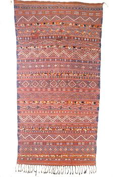 Tummanruskeaan villaloimeen kudottu kuderipsisidoksinen peite (arab. l-handira), johon on kuvioitu värikkäillä lisäkuderaidoilla geometrisia kuvioita, mm. neliöitä, vinoneliöitä ja siksak-linjoja. Joukossa on myös monivärisiä kapeita solmittuja nukkaraitoja. Kuvioiden, kuten siksak-linjojen ja silmää symboloivien vinoneliöiden, on uskottu suojaavan pahalta silmältä. Kudonnaisen pohjaväri on punaruskea. Alapäässä on loimilangoista muodostettu palmikkohapsutus, yläpäässä loimilangat on päätelty tiilenpunaisen lisälangan avulla palmikoimalla. Yläpäässä on myös metallirenkaita. Tekstiiliä on korjattu puuvillakangaspaikoilla nurjalta puolelta. A.O.L. nro 131a