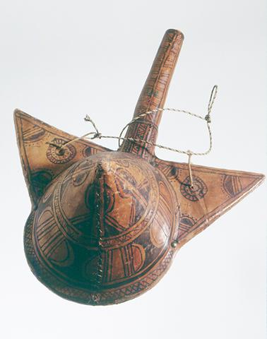 Puinen nahalla päällystetty ruutisäiliö, jossa on poikittain kartion muotoinen maha ja pitkä kapea kaula. Puulevystä tehty kartion pohja haarautuu ylhäällä kaulan molemmin puolin kolmiomaisiksi ulokkeiksi, ikään kuin sarviksi, joihin on sidottu kantonaru. Säiliöön on maalattu mustalla ja punaisella värillä geometrisia kuvioita, mm. mahan tasaiselle sivulle ympyrä ja sen sisäpuolelle risti. A.O.L. nro 131b