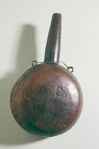 Aprikoosipuusta veistetty ruutipullo (arab. d-duaia del-barud), jossa on pyöreä litteähkö maha ja kapea pitkä kaula. Etupuolelle mahan pintaan lyödyt pistemäiset painanteet muodostavat ristin ja sen ympärille useita ympyräkehiä. Risti on ns. viitoskuvio (keskusta ja neljä sakaraa), jonka on uskottu tuovan onnea ja suojaavan esinettä, sen sisältöä ja omistajaa pahalta silmältä. Kaulaan on lyöty muutama pitkittäinen painannerivi. Sivuilla kaulan alapuolella ovat metalliset renkaat, joihin on sidottu lyhyt metallilanka. Pyöreää irrotettavaa takakantta pitää paikoillaan rautahela. Astiassa on suurehko halkeama. A.O.L. nro 131a