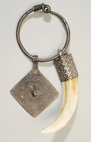 Hopeinen amulettiriipus (arab. fuläts khamsa) ja villisian hammas, jotka on pujotettu rautarenkaaseen. Riipus on kärjellään oleva neliö, jonka toisen puolen keskellä olevaa kohoumaa ympäröi kolme samankeskistä kaiverrettua neliötä. Niistä yksi on ruudutettu, toisessa on yksinkertaisia ornamenttikuvioita. Reunassa kulkee siksak-linja. Hammas on hopeaistukassa, joka on kuvioitu valetulla matalareliefisellä vinoneliöruudukolla. Kussakin ruudussa keskellä on pieni kohouma. Keskusta ja sitä ympäröivät kolme neliötä muodostavat kolminkertaisen viitoskuvion, khamsan, jonka - samoin kuin siksak-linjan - on uskottu torjuvan pahaa silmää. A.O.L. nro 131b Hampaalle on annettu myös numero VK5277:21.
