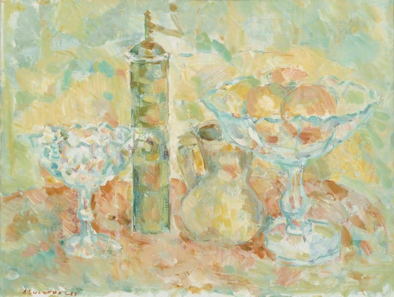| asiasana | asetelma, 'still life' (yleensä), hedelmät, lasiastiat: pullo, juomalasi, tuoppi, ruukku, vaasi jne. |