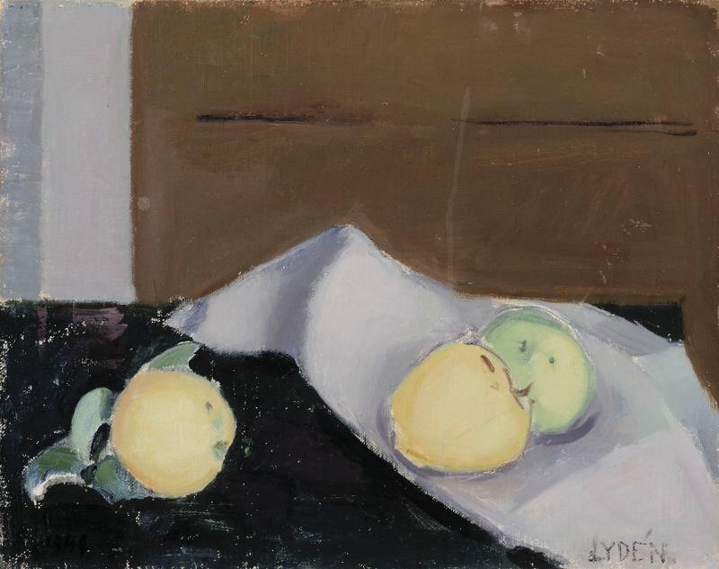 | huomiot | vas.alh. 1949 ; oik.alh.: LYDÉN., takana kiilakehyksessä käsin kirj. liimalappu: Edwin L. Lydén. / Kolme omenaa ; takana kiilakehyksessä ylh. lyijykynällä: J. Sihtola...epäselvää ; Sihtolan ja Säätiön leimat nro 372 ;takana kehyksessä ylh. lyijykynällä: IV alespäin oikea I ;takana taustapahvissa liimalappu: KONSERVOITU / - puhdistettu / - kiinnitetty / -täydennetty / - retusoitu / 27.06. 1984 Pohjanmaan museo ;takana taustapahvissa Alvar Aalto-museon liimalappu: inv.nro 192 (193 pyyhitty yli) |