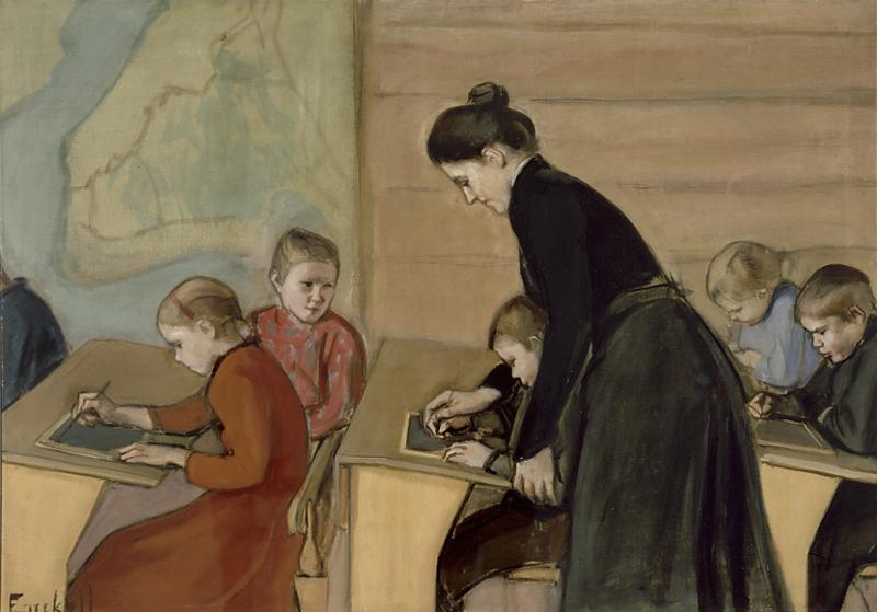 | maalaus: Kansakoulu. Tilaustyö Pariisin maailmannäyttelyyn 1900 Suomen paviljonkia varten |