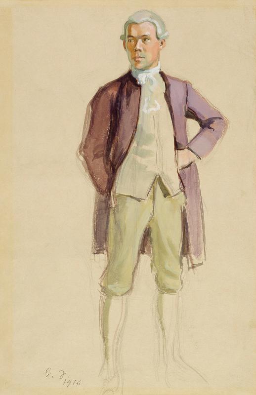 | maalaus: Seisova rokokoopukuinen mies (F.E. Sillanpää), harjoitelma Aurora-seuraa varten |