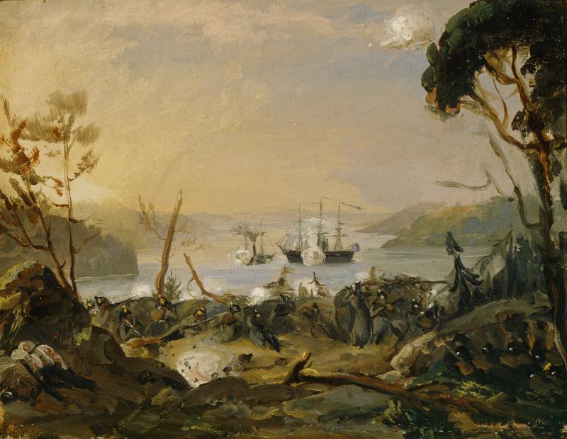 | maalaus: Väkivaltainen tiedustelu Turun seudulla, kohtaus Oolannin sodasta |