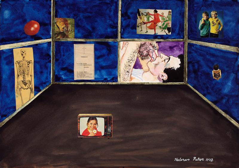 | tekniikka | kollaasi ja vesiväri paperille / akvarell och tidningsurklipp på papper |