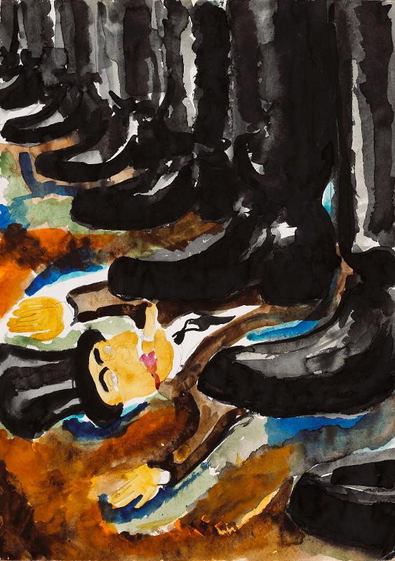 | asiasana | violent death by blows, kicks, pricks, etc., ihmisen kuolema, kengät, jalkineet, viiva, linja (~tasogeometria, geometria), kuolema, saappaat, miehet |