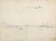 | piirustus: Taitettu paperi jossa luonnoksia purjeveneistä ja saaristomaisemista |