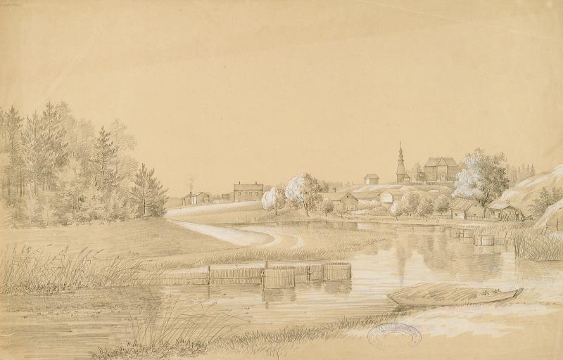 | piirustus: Snappertunan kirkko ja kylää |