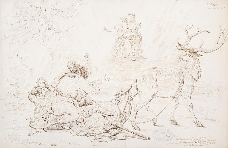 | piirustus: Väinämöinen ja Pohjan neito ; Originaalipiirustus piirrossarjaan "Kalewala, Finsk National-dikt, framställd i teckningar af R.W.Ekman" |
