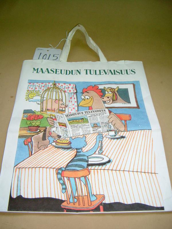 Suorakaiteen mallinen valkoinen paperikassi, jossa 2 kahvaa. Toisella puolella kassissa on kuva kesäisestä suomen maaseudusta, jossa hääpari kahvipöydän ääressä nurmikolla, takana siintää järvi. Kuvassa paljon ihmisiä autoja ja eläimiä. Toisella puolella kassia on kuva eläimistä kahvipöydässä, keskellä kukko lukee maaseudun tulevaisuutta. Kassin yläreunassa molemmin puolin lukee maaseudun tulevaisuus. Kassin on suunnitellut A.Eklund. Sivuissa pyöreä vihreä logo, jonka alapuolella teksti Maaseudun tulevaisuus ja tämän alapuolella vihreistä puoliympyröistä ja havunoksasta koostuva logo, jonka alapuolella lukee Metsänomistaja.