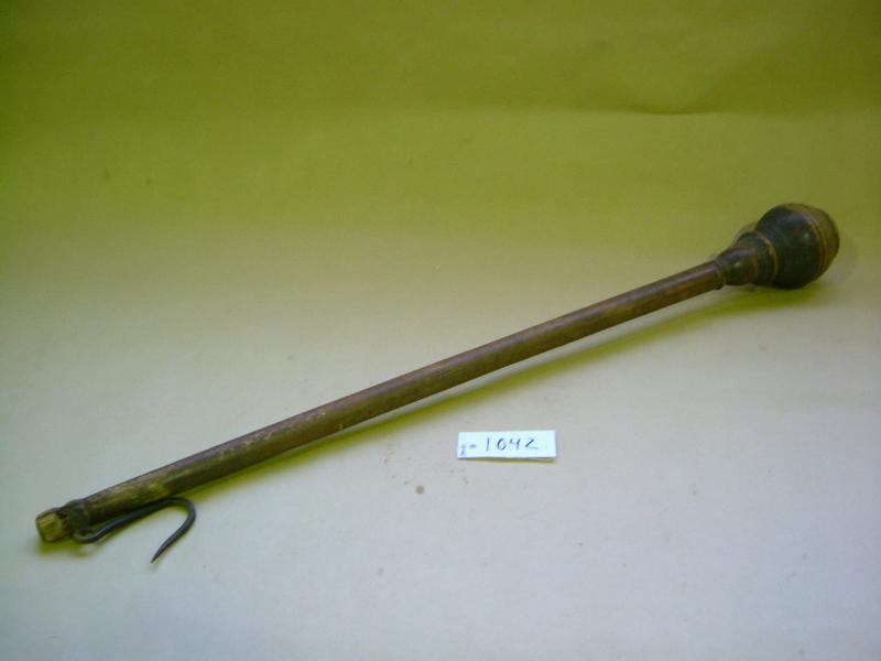 Puinen pyöristetty varsi, jonka toinen pää on pyöreäksi sorvattu ja sen ympäri kulkee raitoja. Toisessa päässä on reikä, johon kiinnitetty rautalangalla kaareva terävä koukku. Varteen on hakattu pieniä niittejä, koukkupäähän tiheämmin ja sitten harvenevat. Puinen ruskeaksi maalattu, sorvattu runko-osa. Toinen pää on sorvattu pallomaiseksi ja profiloitu. Päässä on lyijypaino. Toisessa päässä on reikä, johon on rautalangan (ei alkup.) avulla kiinnitetty rautakoukku. Varressa on veistettyjä merkkejä sekä pieniä metallisia merkkinastoja. Kummassakin päässä on meistattu kruunukuvio. T.I.
