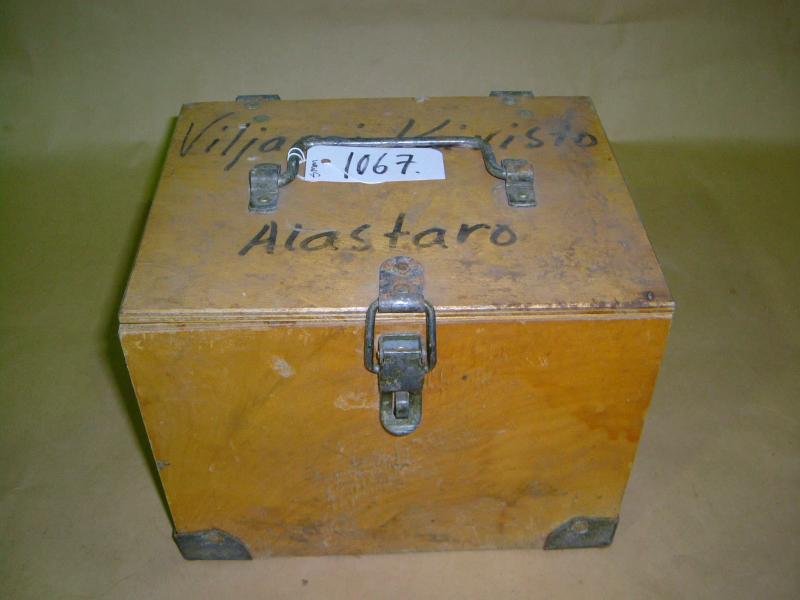 | huomiot | Valmistusaika: n. 1950-luku; Viiteet ja lähteet: Eeva Mikolan muistio lahjoituksesta 11.9.2001.; Merkit: Päällä kannessa mustalla tussilla: VILJAMI KOIVISTO ALASTARO Styroxissa: WARRAK-PAKKAUS Sisäkannessa: NÄYTEMAITOJEN OTTOKERRAT sekä mustalla tussilla 7.; Vauriot: Esine on konservoitu ja se on näyttelykelpoinen.; Lahjoittaja: Esteri (Mäkisepän tila) Koivisto |